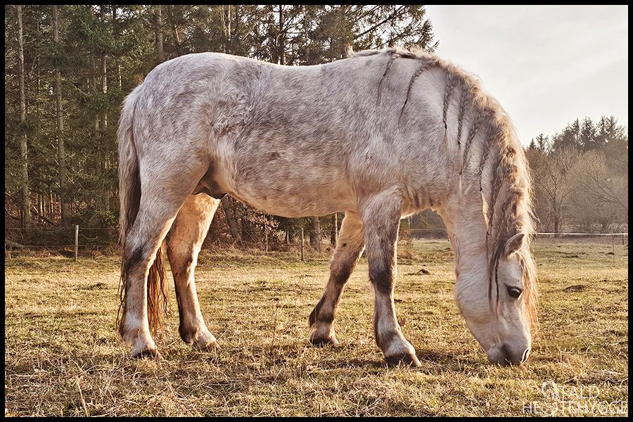 Da Silver var færdig med sin lille lur, var det tid til at spise. Solen var på vej ned, og gav de smukke lys hen over marken. Han er lidt rund den bette ponyfis, men vi skal også snart i gang med at gøre noget ved topmaven – både hans og min, så vi måske kan blive lidt mere fit inden sommeren melder sin ankomst.