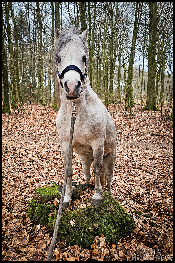 Silver kan stadig huske sit “op”, og stillede sig så fint op på stubben på kommando. Han kan godt lide at løse sådanne opgaver, og elsker f.eks. også at gå i skovbunden hen over grene og ujævnt terræn. Han får lov til dette så meget som muligt, da det jo er rigtig godt for ham.