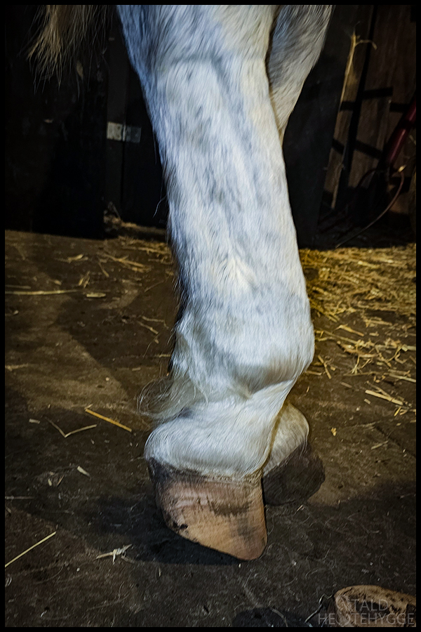 … så blev jeg mødt at synet af en lille Sille, der kom gående på 3 ben. Han støttede nærmest ikke på sin højre baghov. Det er den lyse hov, der er mest ramt af forfangenhed. Det er også den hov, der har været udsat for mest belastning, da Silver havde sin seneskade i efteråret/vinteren 2025 på venstre bagben.