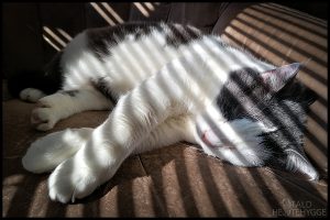 Oskar var noget mere reserveret, da vi fik ham hjem, end han var på internatet. Han viste sig også, at være lidt af en ninja-kat, der gerne langede ud efter vores fødder, eller pludselig reagerede med bid og krads, når han blev aet. Vi lærte hurtigt, at al berøring efter pletten på maven var forbudt.